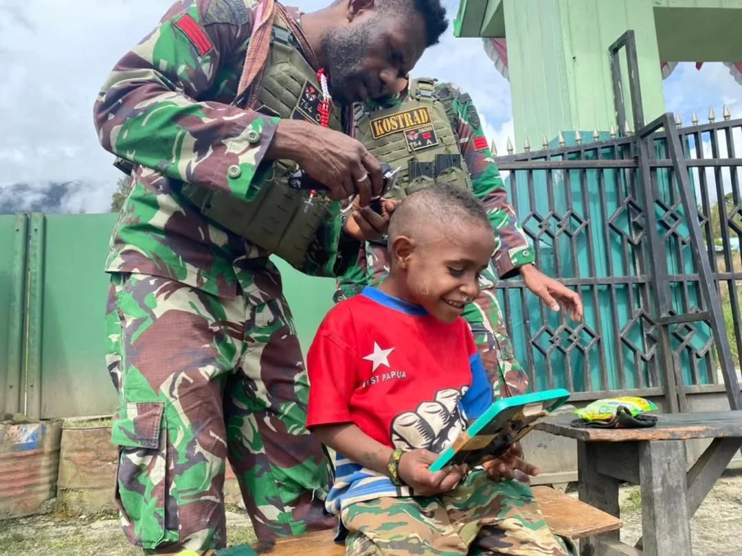Dalam suasana penuh kehangatan, prajurit TNI memberikan layanan cukur rambut gratis kepada anak-anak setempat.