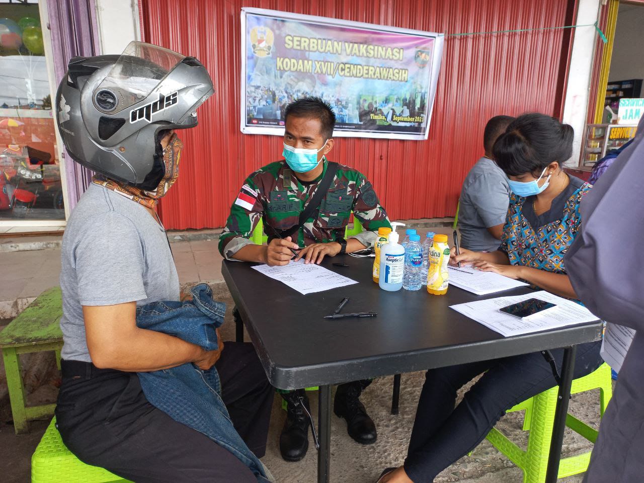 Berita Timika—  Aparat TNI dari Kodim 1710/Mimika Kodam XVII/Cenderawasih kembali melaksanakan vaksinasi mobile Covid-19, bertempat di Bundaran SP. 2 Jl. Cenderawasih, Distrik Mimika Baru, Kab. Mimika, Kamis (16/09/2021).