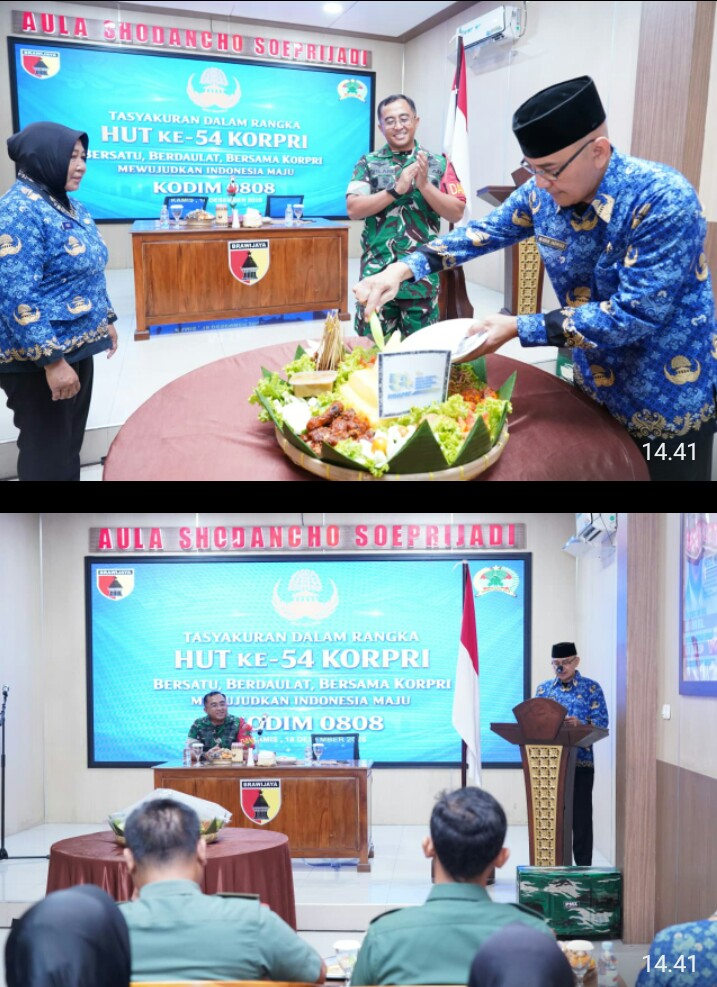 Blitar – Dalam rangka memperingati Hari Ulang Tahun (HUT) Korps Pegawai Republik Indonesia (Korpri) ke-54 Tahun 2025, Kodim 0808/Blitar menggelar kegiatan syukuran bertempat di Aula Makodim 0808/Blitar Jl. Ahmad Yani No. 6 Kelurahan/Kecamatan Kepanjen Kidul Kota Blitar, Kamis (18/12/2025).