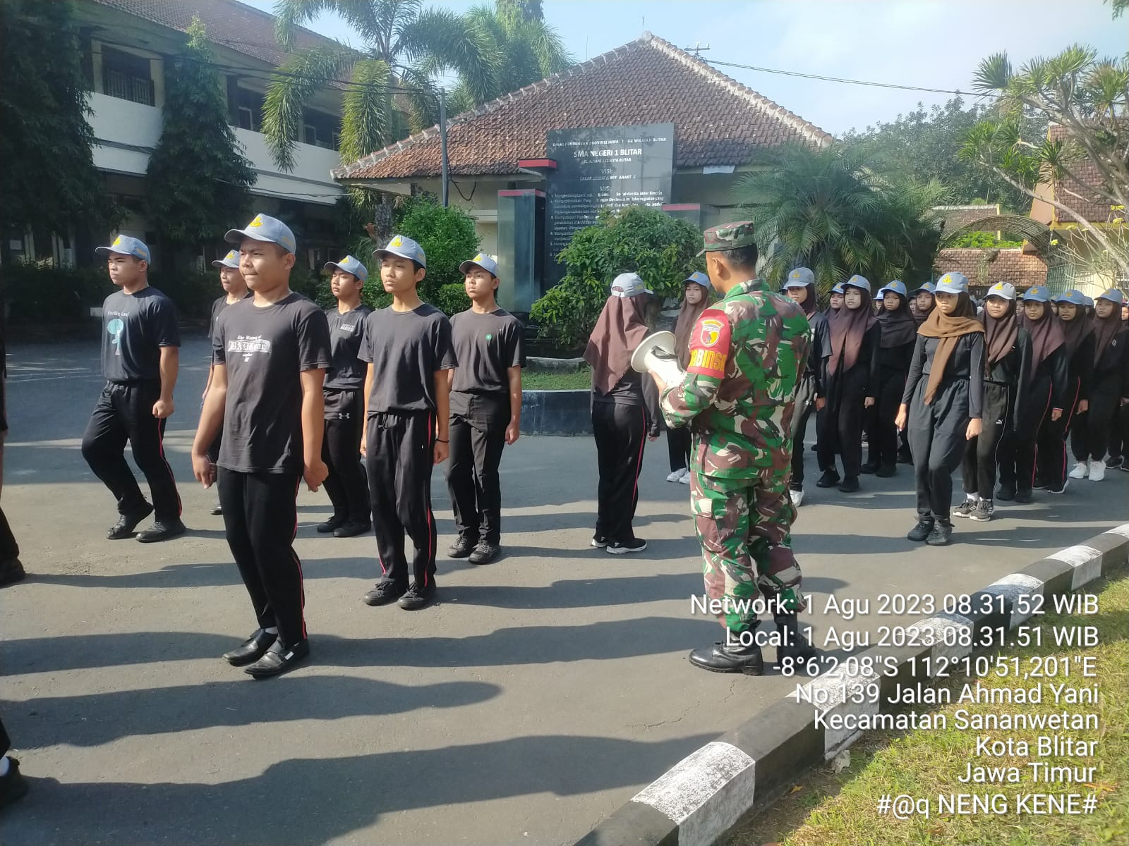 Kegiatan latihan peraturan baris berbaris ini, dilaksanakan di halaman SMAN 1 Jl. A. Yani No. 112 Kec. Sananwetan Kota Blitar, Selasa (1/8/2023).