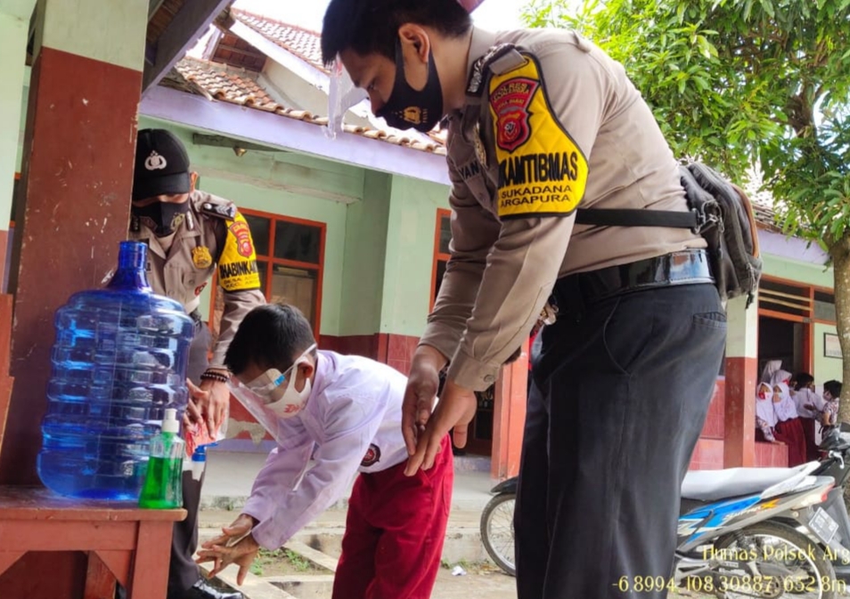 Dipimpin langsung Kapolsek Argapura IPTU Sarjiyo beserta Anggota Polsek Argapura selain membagikan masker Gratis terhadap para Siswa SDN Sukasari Kaler Kecamatan Argapura sekaligus mensosialisasikan Tiga M atau Menggunakan Masker, Mencuci Tangan, Menjaga jarak itu menjadi salah satu bentuk cara memutus mata rantai virus Covid-19.