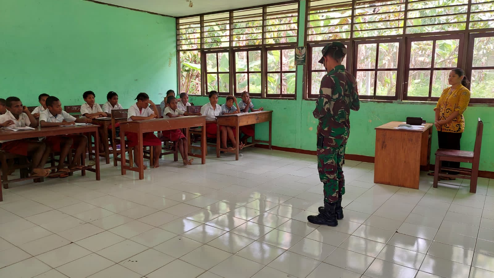Berita Kab.Keerom— Personel Pos Waris Satgas Pamtas RI-PNG Yonif 126/KC menjadi tenaga pengajar Sekolah Dasar Kanandega di Kampung Banda, Distrik Waris, Kab. Keerom, Papua. Menjadi tenaga pengajar di wilayah perbatasan Papua, merupakan program Satgas Yonif 126/KC mengingat jumlah tenaga pendidik di perbatasan masih minim. Program ini dilaksanakan dalam rangka turut mendukung program pemerintah untuk mencerdaskan kehidupan bangsa khususnya kepada generasi penerus di perbatasan Papua melalui jalur pendidikan formal (sekolah).