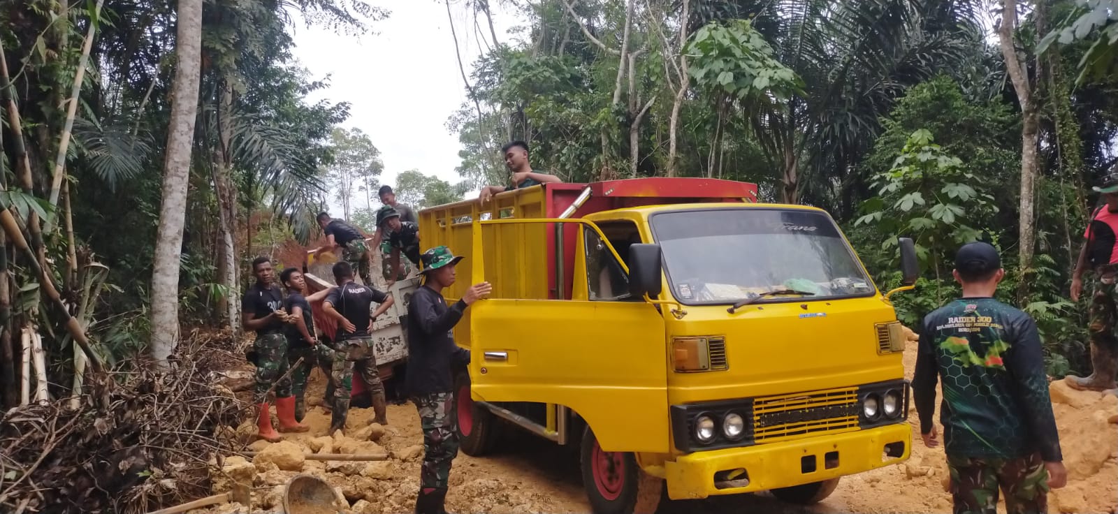 Walau Panasnya terik matahari tidak menghalangi para anggota TNI dan masyarakat membangun jalan dalam program TMMD ke 123