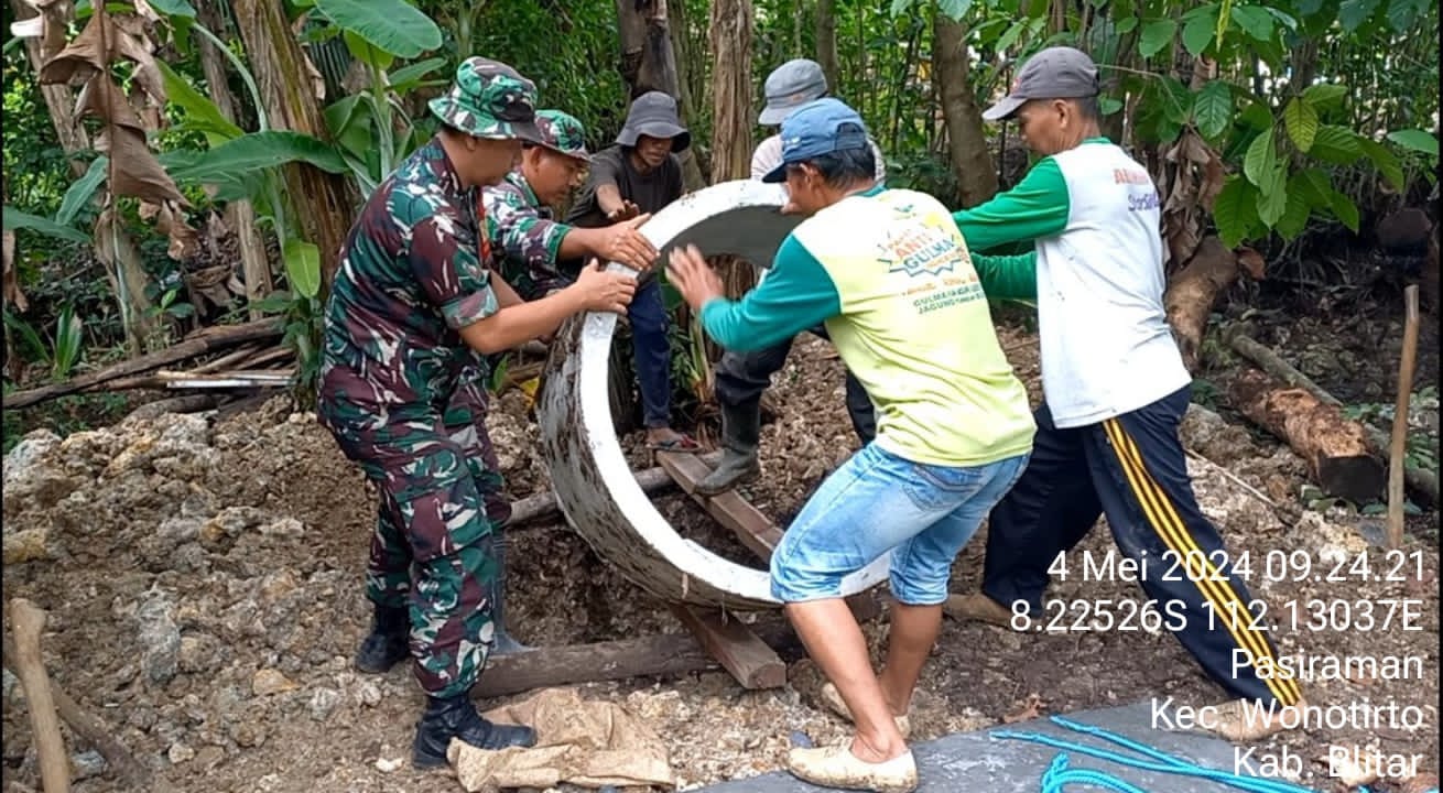 Blitar – Dalam upaya mewujudkan lingkungan yang sehat dan layak huni, anggota Pos Wonotirto Koramil 0808/09 Sutojayan bersama masyarakat bergotong-royong membantu membangun jamban yang sudah tidak layak milik Bapak Supani warga kurang mampu Dusun Kempul Desa Pasiraman Kecamatan Wonotirto Kabupaten Blitar, Sabtu (4/5/2024).
