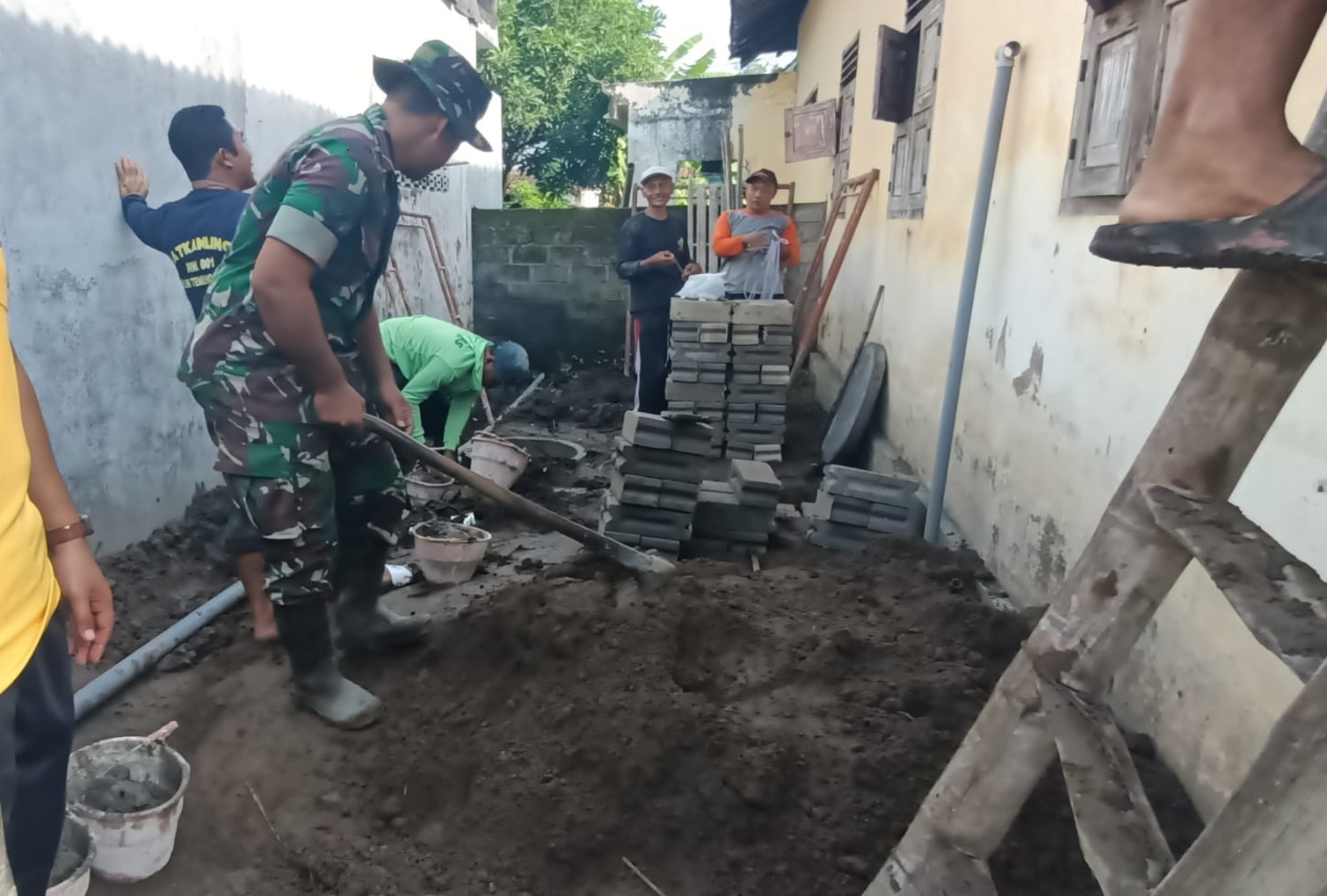 Kegiatan tersebut dilaksanakan dengan membantu pembuatan MCK milik Ibu Rokayah. Dalam prosesnya, Babinsa bersama warga bahu-membahu mengerjakan berbagai tahapan pembangunan, mulai dari pembuatan pondasi, pemasangan dinding, hingga penyempurnaan fasilitas agar layak digunakan.