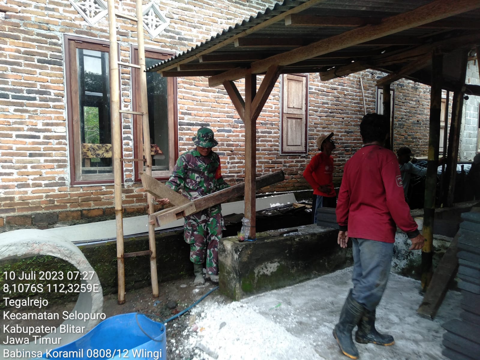 Kodim Blitar – Untuk mewujudkan rumah layak huni bagi warga kurang mampu yang ada di wilayah binaan, Babinsa Pos Selopuro Koramil 0808/12 Wlingi Kodim 0808/Blitar Serka Aminoto dan anggota Pos Selopuro bersama warga, melaksanakan kegiatan kerja bakti dan gotong royong, untuk membantu merehab rumah tidak layak huni milik Ibu Djaenab, bertempat di Dusun Ngandengan RT. 05 RW. 02 Desa Tegalrejo Kec. Selopuro Kab. Blitar, Senin (10/7/2023).