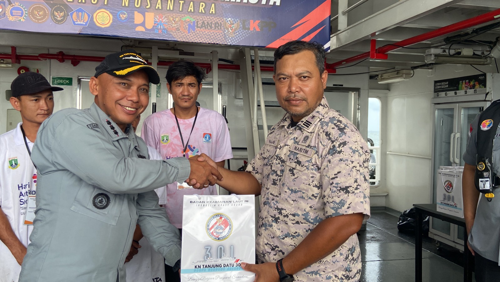 Acara serah terima dilaksanakan di geladak helikopter KN. Tanjung Datu-301 oleh Laksma Bakamla Bambang dengan perwakilan pihak Konjen Johor Ibu Leny Marliani. Serah terima tersebut turut disaksikan oleh Komandan KN. Tanjung Datu-301 Kolonel Bakamla Rudi Endratmoko S.E., M.M., M.Tr.Opsla., perwakilan pihak APMM, Muspika Pulau Buru, serta Bakamla RI.