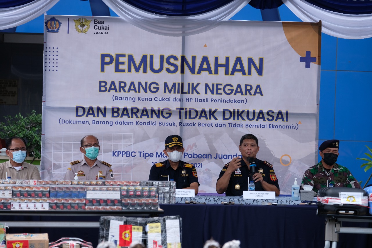 Barang-barang hasil penindakan berupa Handphone dan rokok tanpa dilekati pita cukai tersebut, telah ditetapkan sebagai Barang Milik Negara dan telah ditetapkan peruntukannya oleh Direktorat Jenderal Kekayaan Negara atas nama Menteri Keuangan untuk dilakukan pemusnahan. Pemusnahan dilakukan oleh Bea Cukai Juanda dengan mengundang instansi dan perusahaan terkait. Selain pemusnahan Barang Milik Negara yang telah disebutkan di atas, terdapat Barang yang Dinyatakan Tidak Dikuasi berupa dokumen dan Barang yang Dinyatakan Tidak Dikuasai dalam kondisi busuk, rusak berat dan tidak bernilai ekonomis yang turut dimusnahkan.