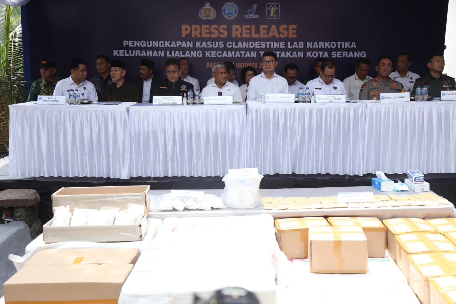 Banten, 2 Oktober 2024–Badan Narkotika Nasional (BNN) berhasil mengungkap kasus clandestine laboratory di sebuah rumah mewah yang berlokasi di Kota Serang, Banten, pada Jumat (27/9). Tim BNN mengamankan 10 (sepuluh) orang tersangka dengan total barang bukti berupa 971.000 butir narkotika jenis PCC (Paracetamol, Caffeine, Carisoprodol).