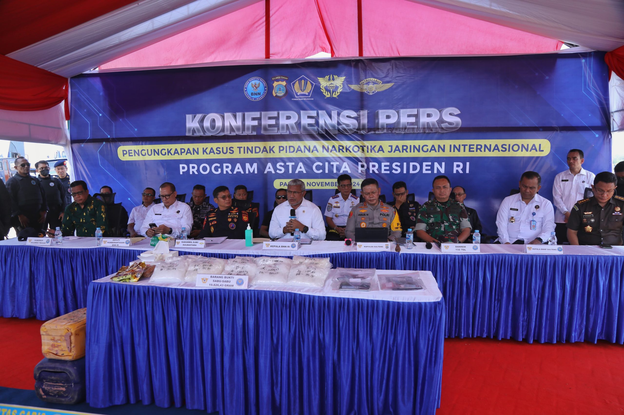 Sulawesi Tengah, 21 November 2024– Badan Narkotika Nasional Republik Indonesia (BNN RI) bersama Bea dan Cukai berhasil melakukan pemberantasan peredaran gelap narkotika golongan I jenis sabu di Palu, Sulawesi Tengah. Tiga orang pelaku berinisial H, N dan M diringkus oleh petugas beserta barang bukti seberat 19.846,43 (Sembilan belas ribu selapan ratus empat puluh enam koma empat puluh tiga) gram. Diketahui, kelompok ini merupakan jaringan Internasional Malaysia – Indonesia. Para tersangka berangkat ke Pulau Sebatik menuju Pulau Bunyu untuk mengambil barang haram yang akan diantarkan ke perairan Donggala, Sulawesi Tengah.