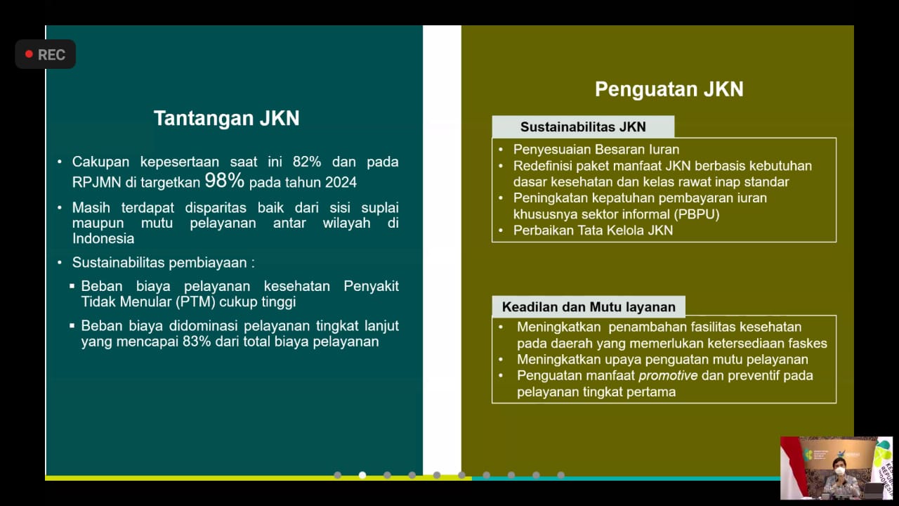 Sementara itu, Wakil Menteri Kesehatan RI, Dante Saksono Harbuwono mengatakan, ada sejumlah upaya yang harus dilakukan untuk menjaga sustainabilitas Program JKN-KIS antara lain dengan menyesuaikan besaran iuran, redefinisi paket manfaat JKN berbasis kebutuhan dasar kesehatan dan rawat inap standar, peningkatan kepatuhan pembayaran iuran (khususnya dari sektor informal atau Pekerja Bukan Penerima Upah/PBPU), dan perbaikan tata kelola JKN. Selain itu, dalam hal keadilan dan mutu