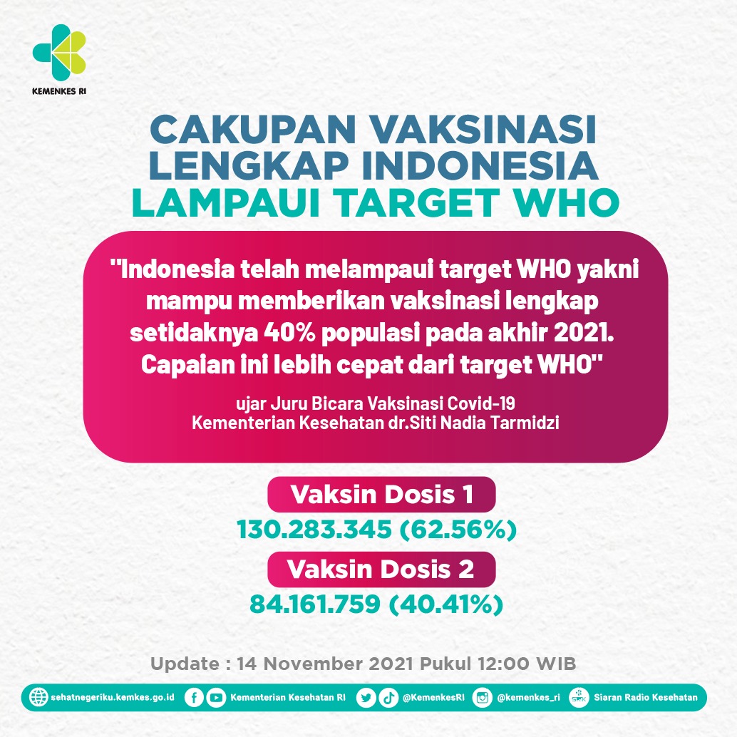 Juru Bicara Vaksinasi COVID-19 Kementerian Kesehatan dr. Siti Nadia Tarmidzi mengatakan dengan demikian Indonesia telah melampaui target WHO tersebut, yakni mampu memberikan vaksinasi lengkap setidaknya 40% populasi pada akhir tahun 2021.