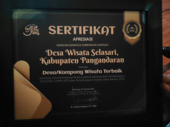 BANDUNG — Prestasi membanggakan kembali ditorehkan Desa Wisata Selasari, Kabupaten Pangandaran. Desa tersebut meraih Sertifikat Apresiasi Desa/Kampung Wisata Terbaik Jawa Barat Tahun 2025 dari Pemerintah Provinsi Jawa Barat, Selasa (27/1/2026).