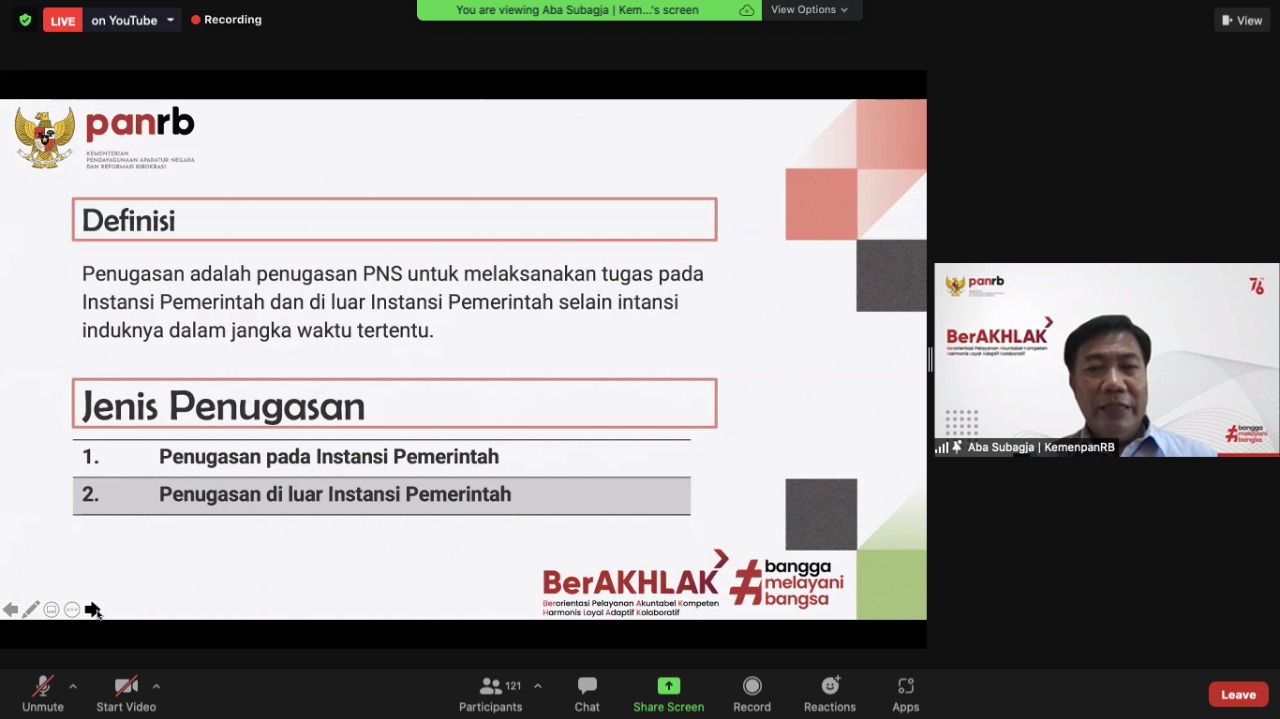 Hal ini untuk menjamin kesinambungan sistem karier ketika seorang PNS kembali ke instansi asalnya maupun menetap di instansi dimana saat ini statusnya masih dipekerjakan/diperbantukan. “Instansi pemerintah agar segera mempercepat penetapan status penugasan PNS pada masing-masing instansi, karena ini akan terkait dengan administrasi yang ada di BKN,” jelas Aba dalam _Forum Group Discussion_ Koordinasi Penerapan PermenPANRB No. 62/2020, secara virtual, Jumat (10/09).