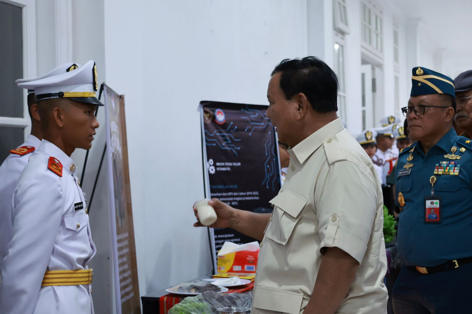 Saat meninjau, Menhan Prabowo melihat hasil-hasil karya cipta kadet mahasiswa Poltekhan UNHAN RI Ben Mboi, mulai dari produk olahan makanan tradisional sampai kepada pupuk tanaman buatan, seperti makanan olahan ternak dari limbah dapur, kopi jagung, pengolahan ikan Nipi menjadi sambal, mesin tetas dari limbah kayu sampai kepada pengolahan pupuk dari tinja.
