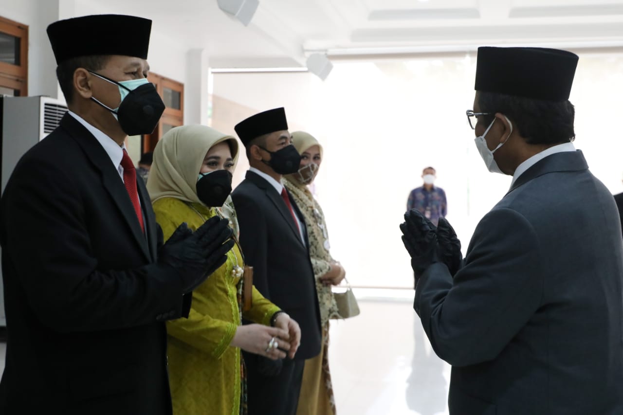 Menko Mahfud melantik Deputi Bidang Koordinasi Komunikasi, Informasi, dan Aparatur, Marsda TNI Arif Mustofa, dan Deputi Bidang Koordinasi Politik dalam Negeri Brigjen TNI Djaka Budhi Utama, pada Jumat (13/8) di kantor Kemenko Polhukam.