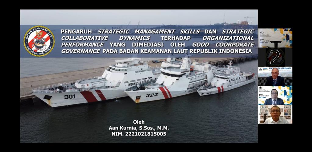 Pada sidang terbuka yang digelar secara daring ini, Kepala Bakamla memaparkan dan mempertahankan disertasinya yang berjudul pengaruh strategic managemen skill dan collaborative dynamic terhadap organizational performance yang dimediasi oleh good corporate governance pada Bakamla RI.