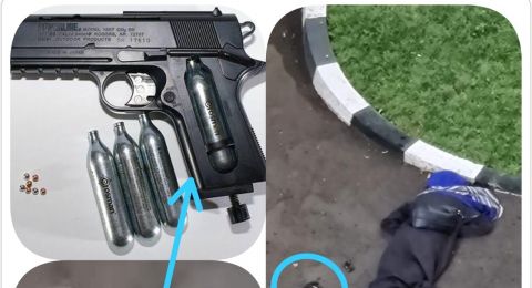 “Dari hasil pengamatan gambar senjata yang dipergunakan pelaku jenis pistol Airgun BB bullet call 4,5mm,” kata Argo dalam keterangan resminya, Jakarta, Kamis (1/4).