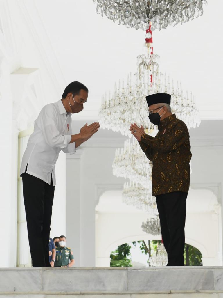 Usai pertemuan, Presiden Jokowi tampak mengantarkan Wapres Ma’ruf Amin hingga ke tangga Istana Merdeka.