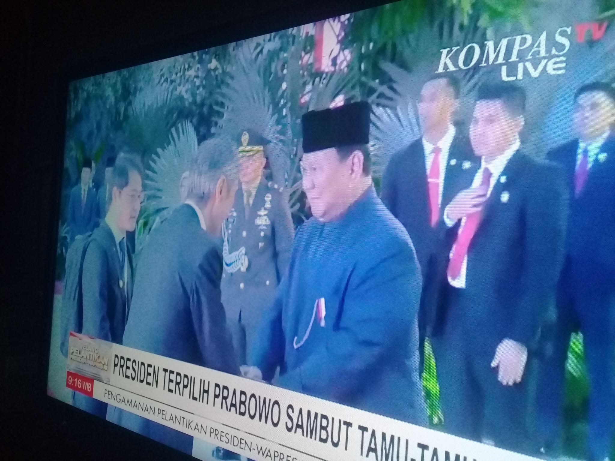 Prabowo yang memakai baju khas betawai berdiri tegak seiring denga senyum lesung pipitnya menunggu tamu negara sampai bersalaman dengan mengucapkan selamat datang di pelantikannya,ada 33 tamu negara yang hadir