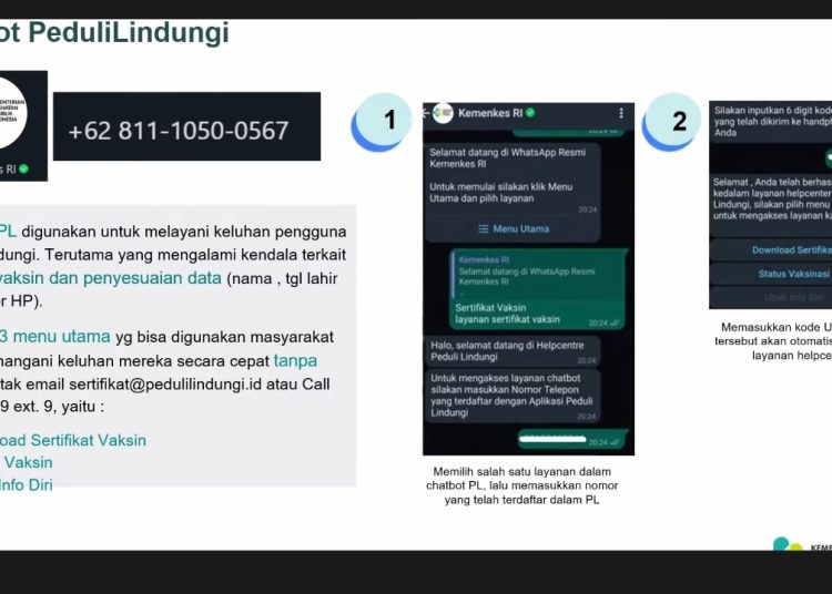 “Oleh karena itu, Kemkes RI menghadirkan layanan chatbot PeduliLindungi untuk mengatasi permasalahan yang berkaitan dengan sertifikat, status vaksinasi, dan perbaikan info diri,” katanya pada konferensi pers Peluncuran Chatbot Whatsapp PeduliLindungi secara virtual, Rabu (10/11) di Jakarta.